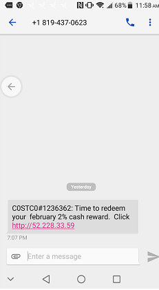 Scammers began adopting cloud services such as Azure, AWS, Alibaba, and Google Docs and others for their activities. They use them to place their malicious crafts and mislead gullible dummies to get access to bank accounts or information about credit cards. Recently I received text message on my cell phone. The message suggested me to redeem my Costco award.